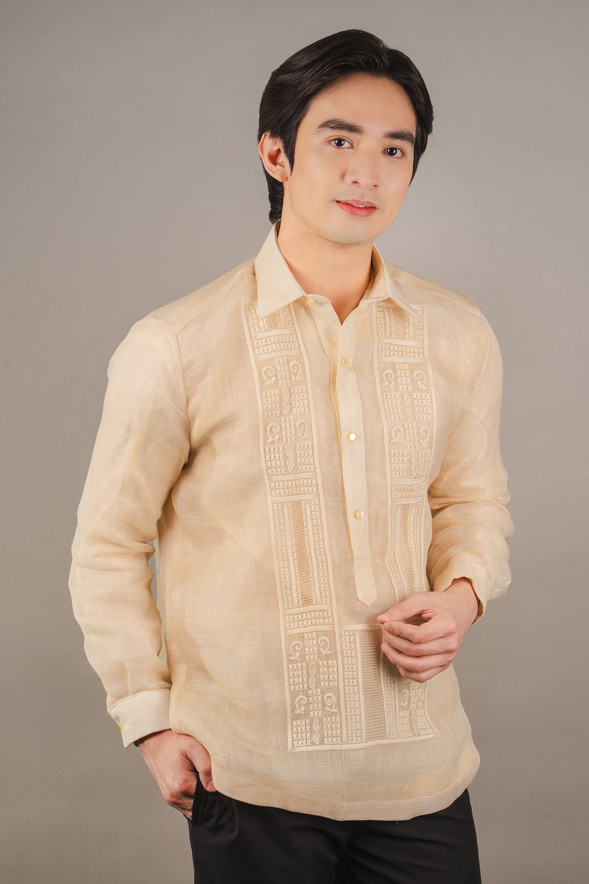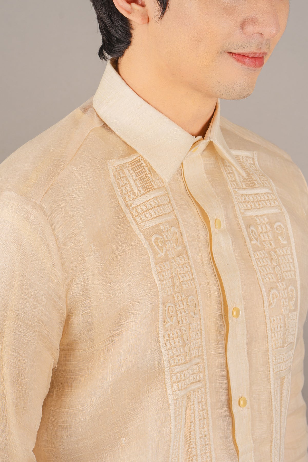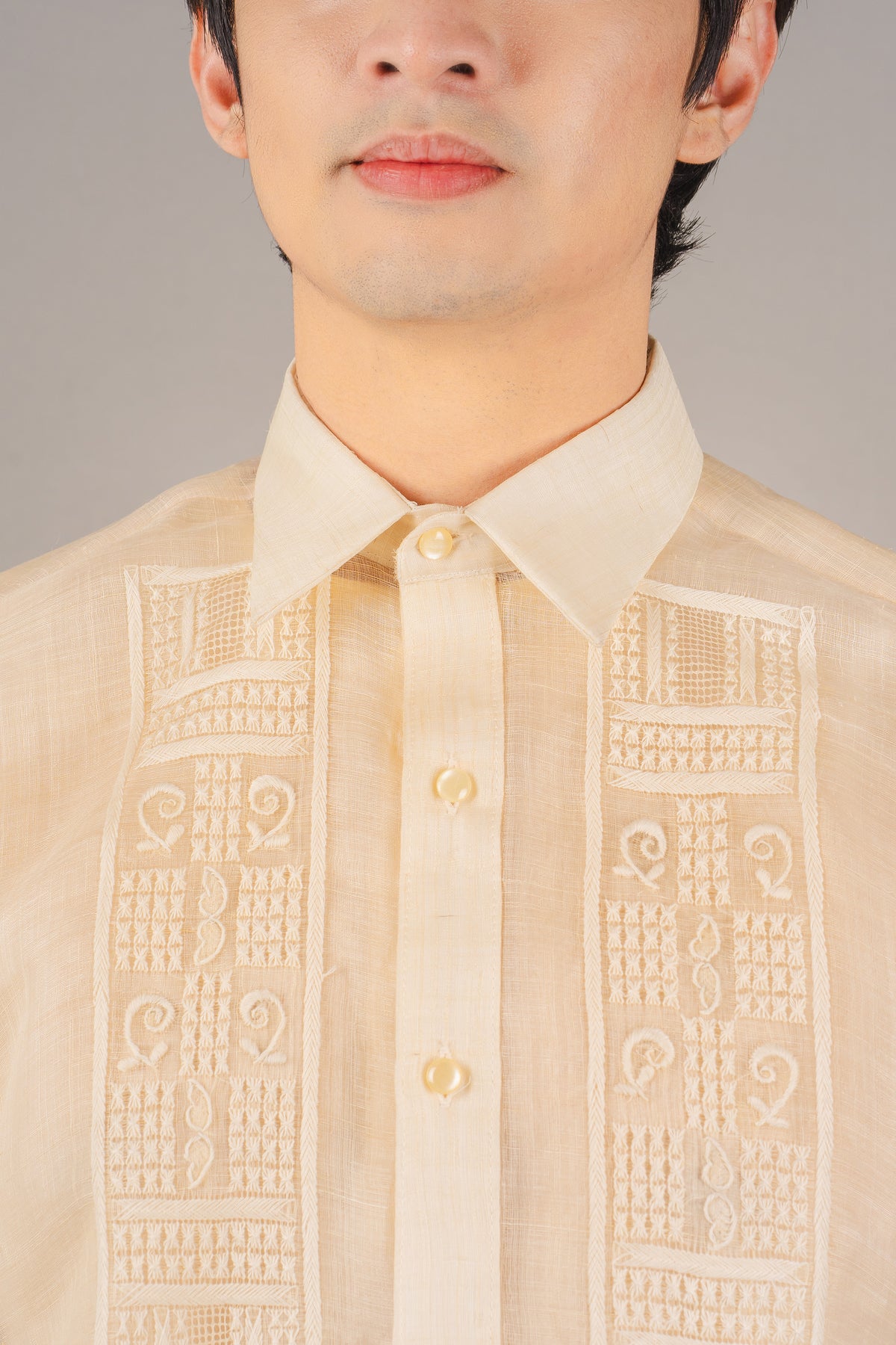 Material: Piña PureEmbroidery: Ethnic (Closed Pitchera)Size: Neck 15 1/2 inches; Sleeve Length 33 inchesEmbroidered in Lumban, Philippines