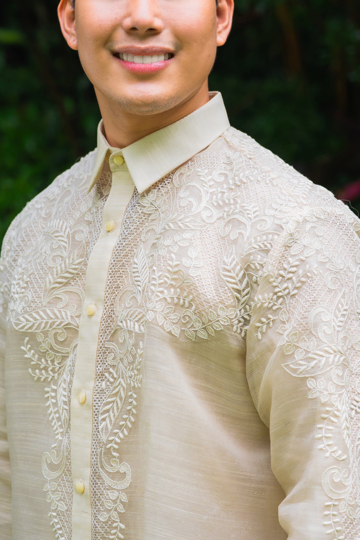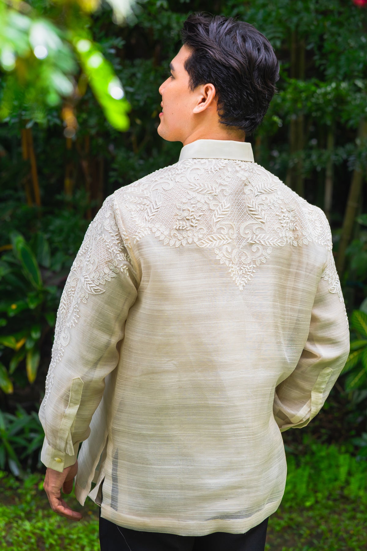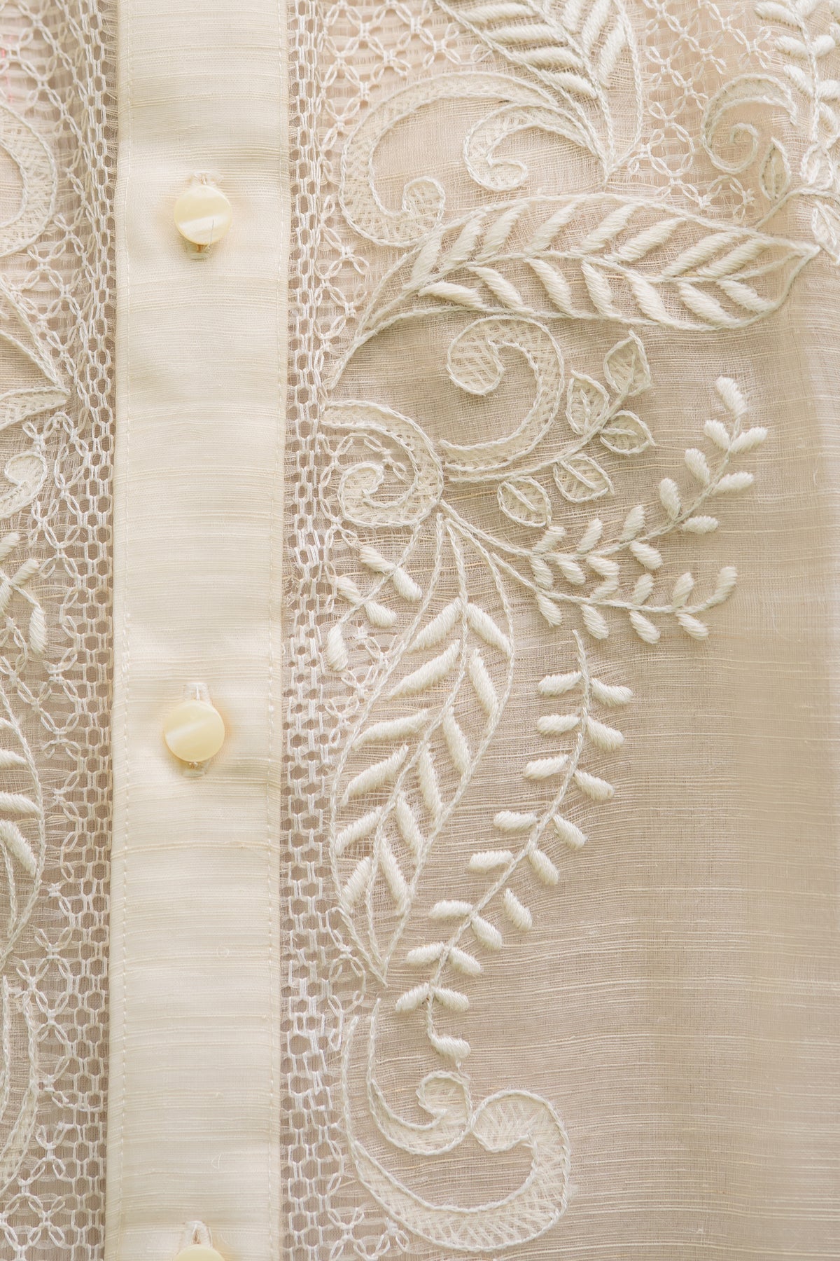 Material: Piña SilkEmbroidery: Traditional (Open All The Way)Size: Neck 16 1/2 inches; Sleeve Length 33 inchesEmbroidered in Lumban, Philippines