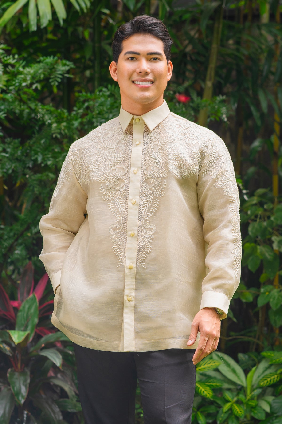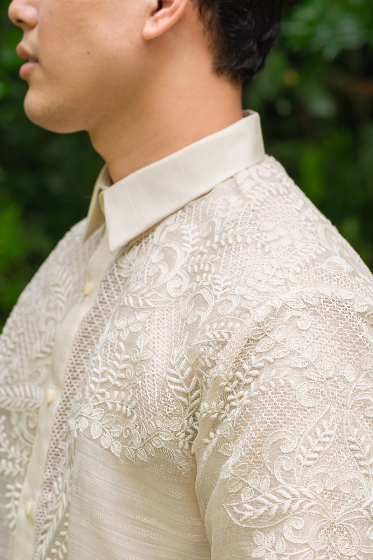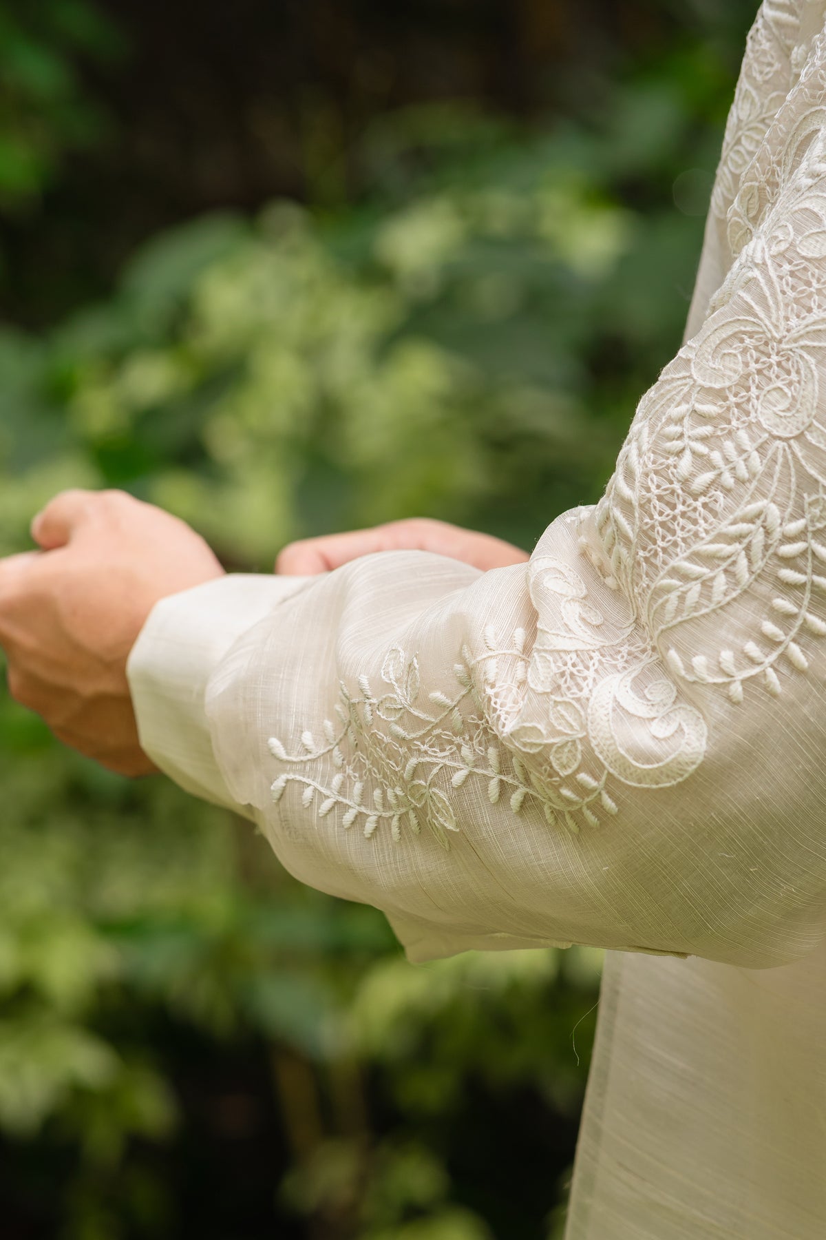Material: Piña SilkEmbroidery: Traditional (Open All The Way)Size: Neck 16 1/2 inches; Sleeve Length 33 inchesEmbroidered in Lumban, Philippines
