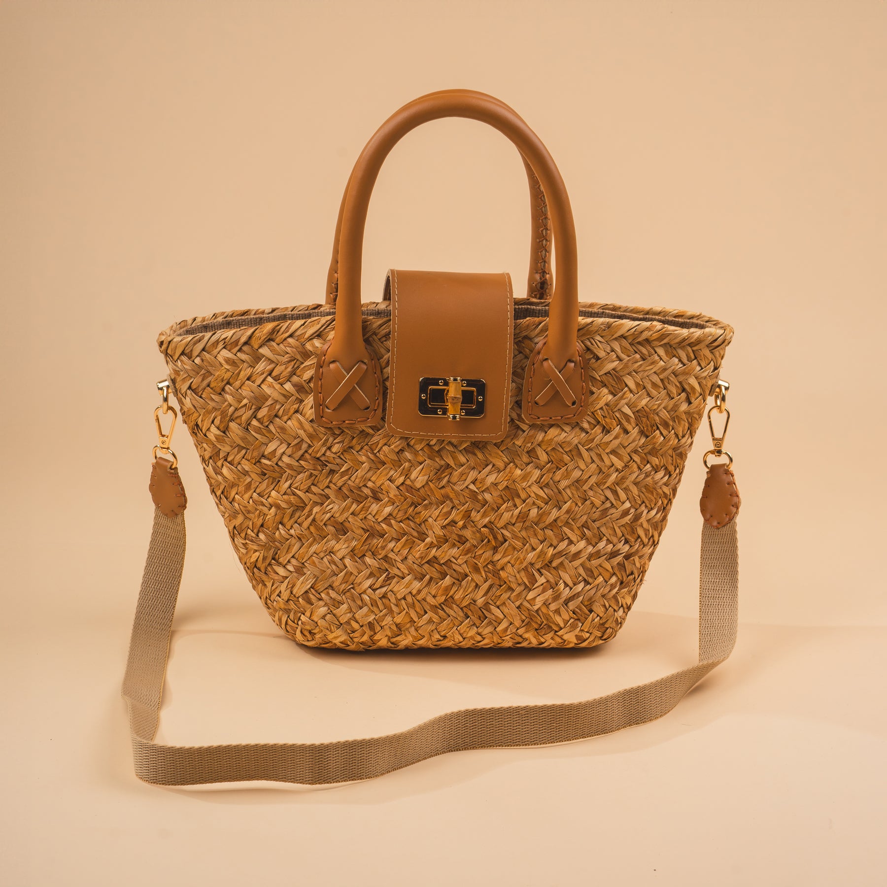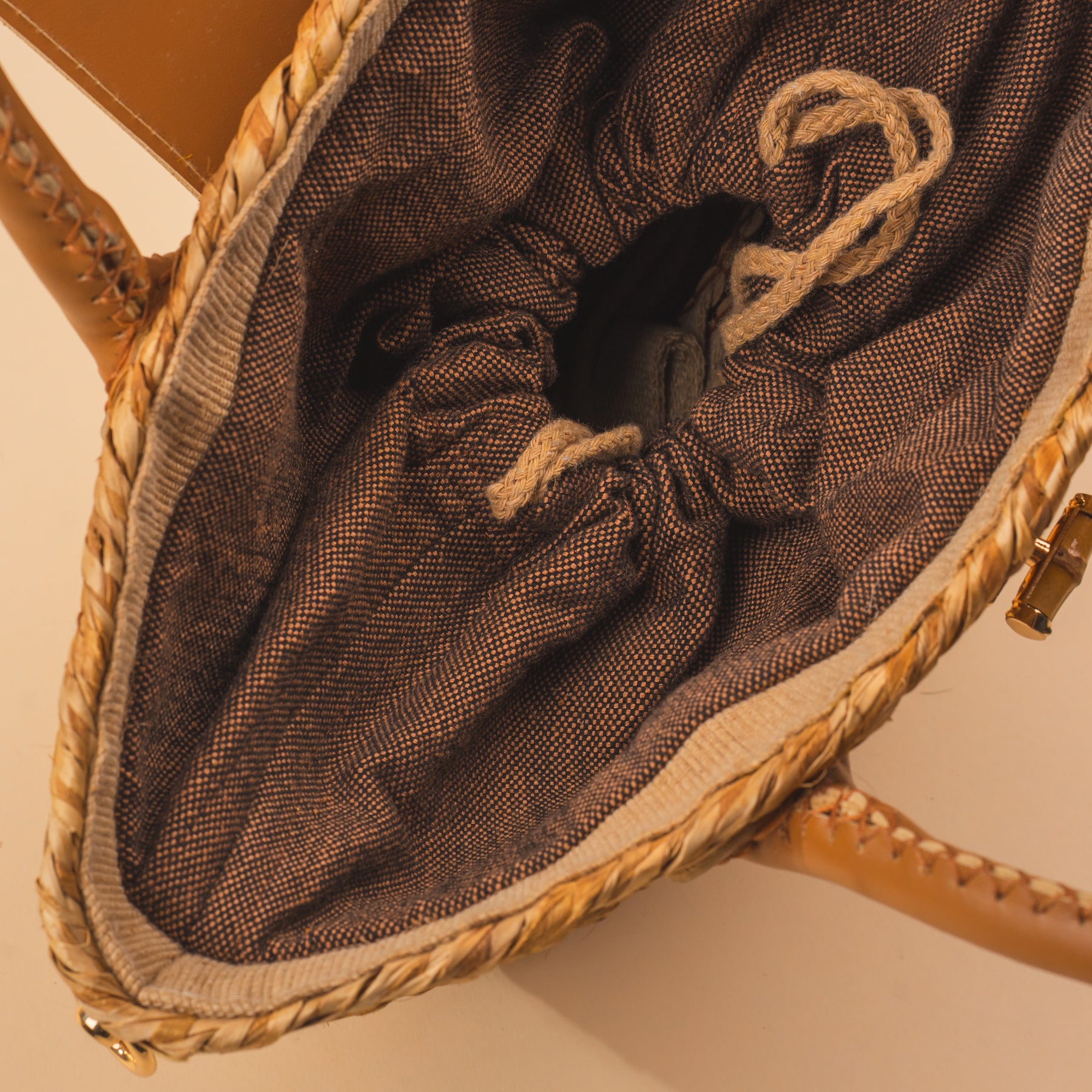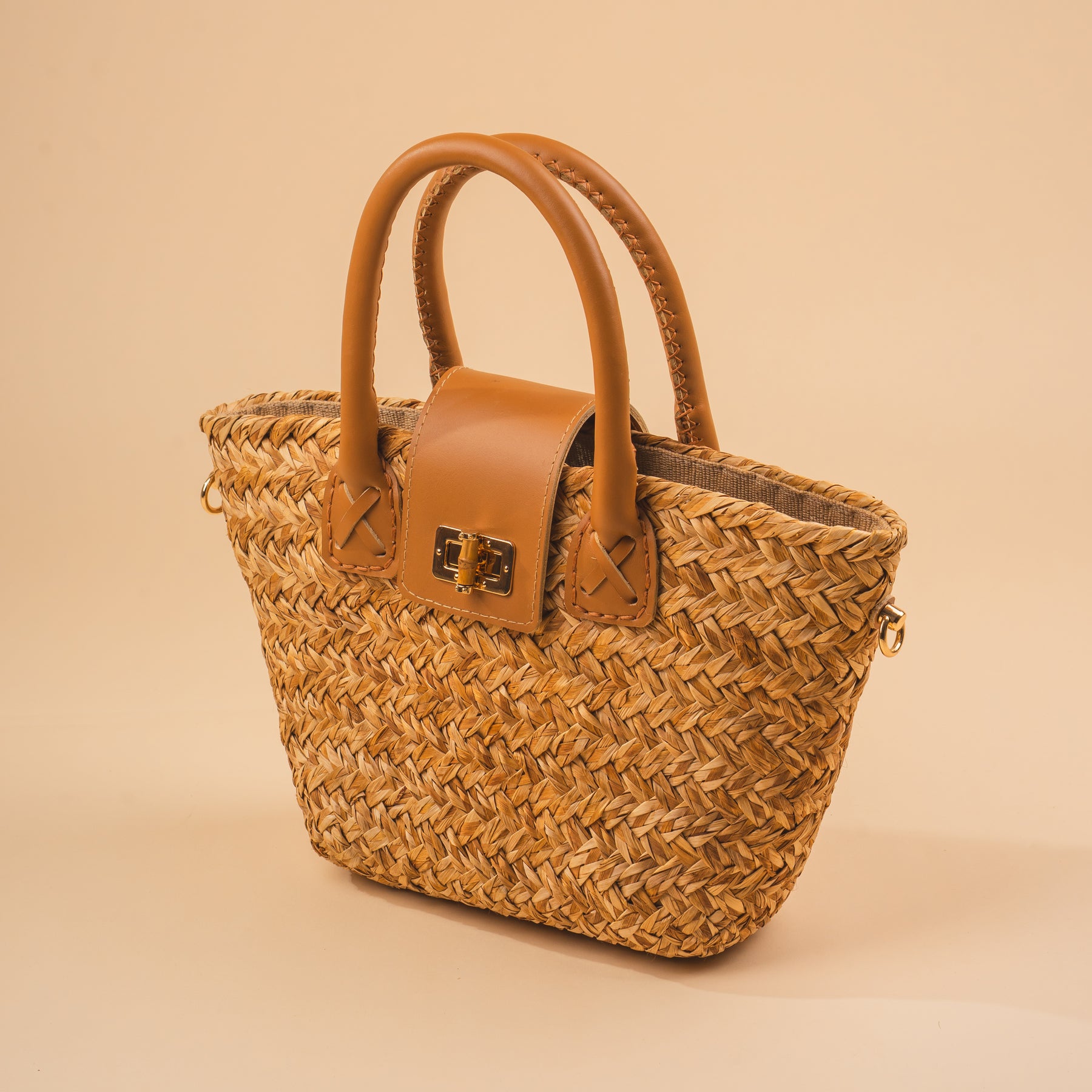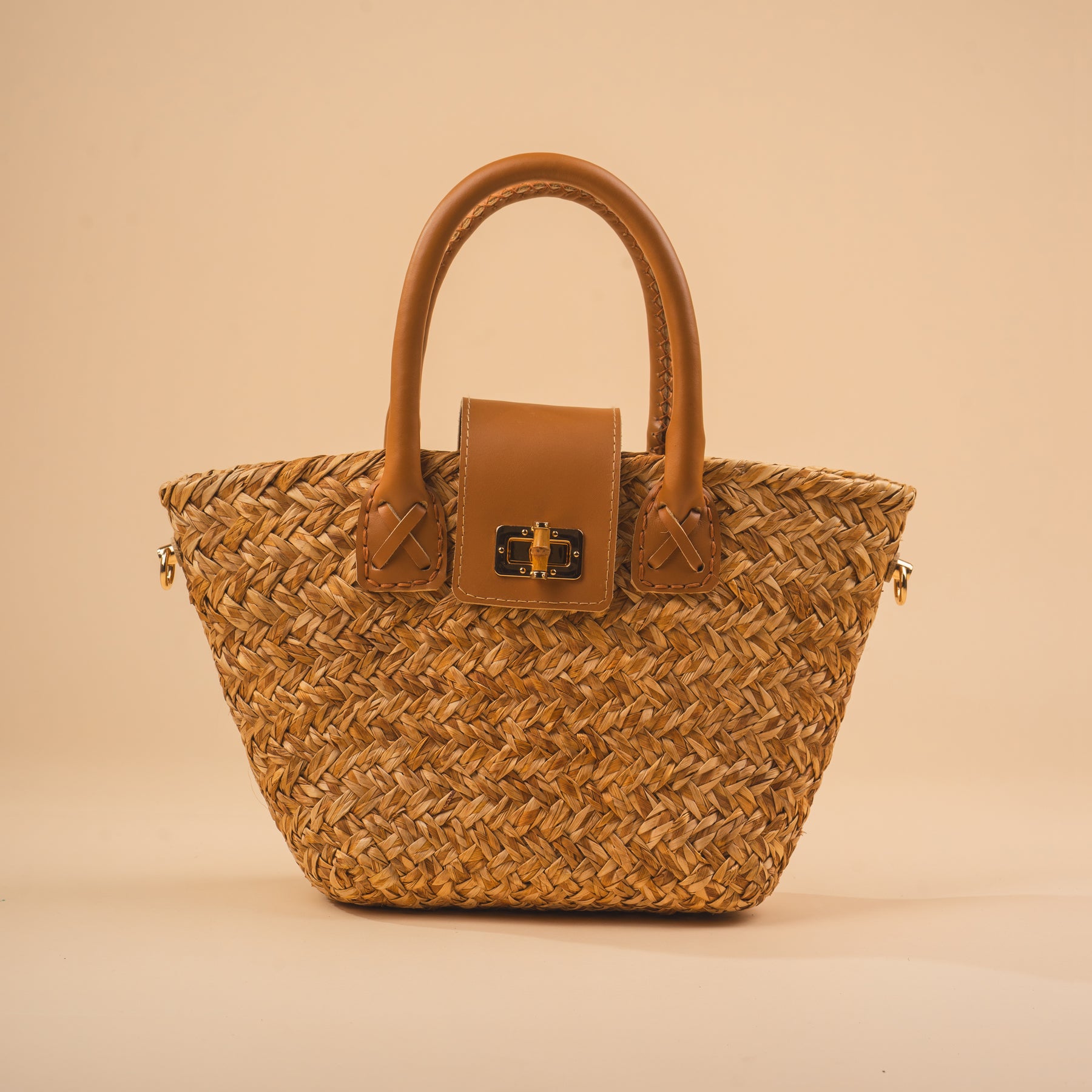 (One of a Kind Design)Material: Natural AbacaDesign: Handbag w/ Leather Handle & StrapColor: Natural BrownSize: Medium